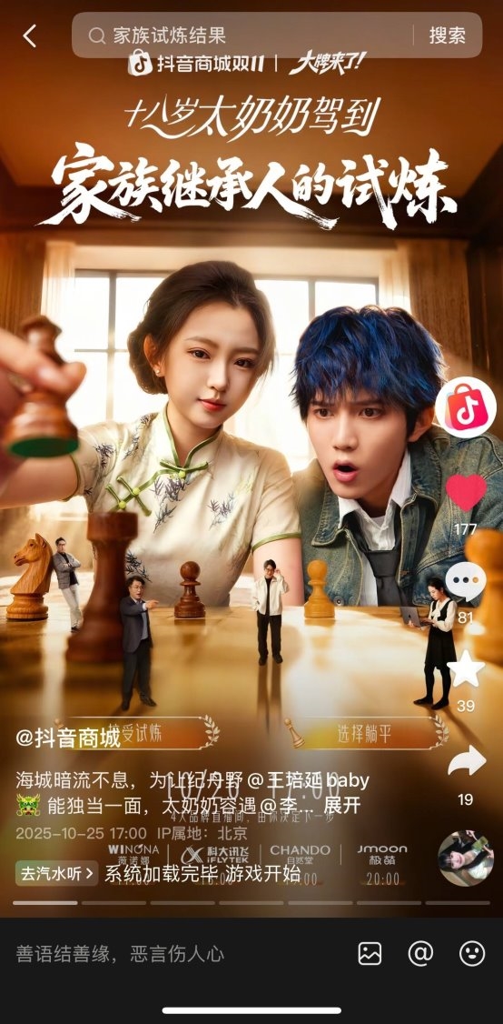 抖音商城是懂押寶的,一把就抓住了《太奶奶3》這頂級IP的情緒流量,把品牌完美“嵌”進了爽劇的基因里。劇粉們看完《太奶奶3》的失落還沒來得及發作,新鮮的故事就安排上了;彈幕里“給我演”的呼聲剛落,實時投票決定故事走向的權限就到手了。好家伙,瞬間從屏幕外的“嗑學家”晉級成能左右主角命運的“幕后導演”了,真讓我體驗了一把太奶奶的掌權人生。